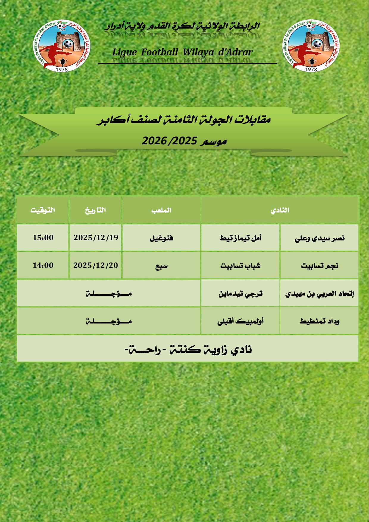 جميع الحقوق محفوظة © 2023 - 2026 الرابطة الولائية لكرة القدم - أدرار.