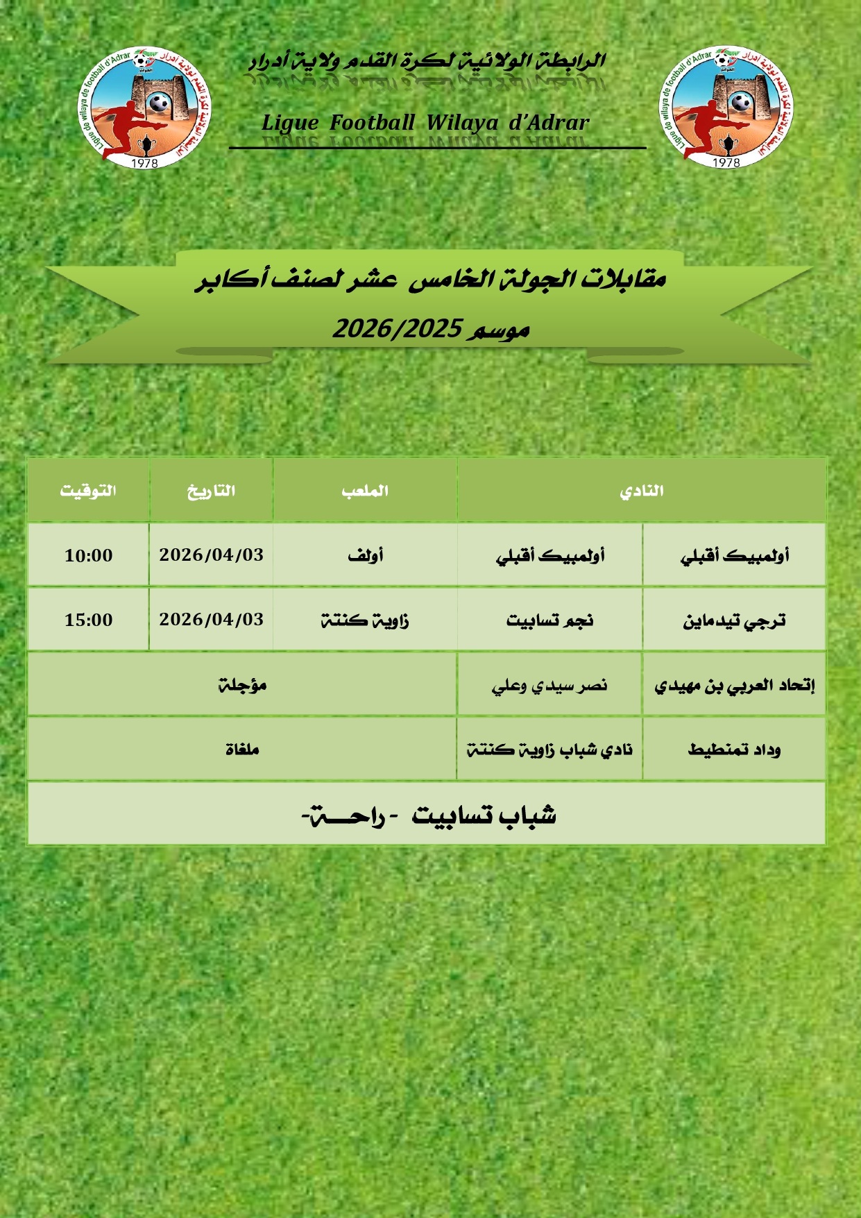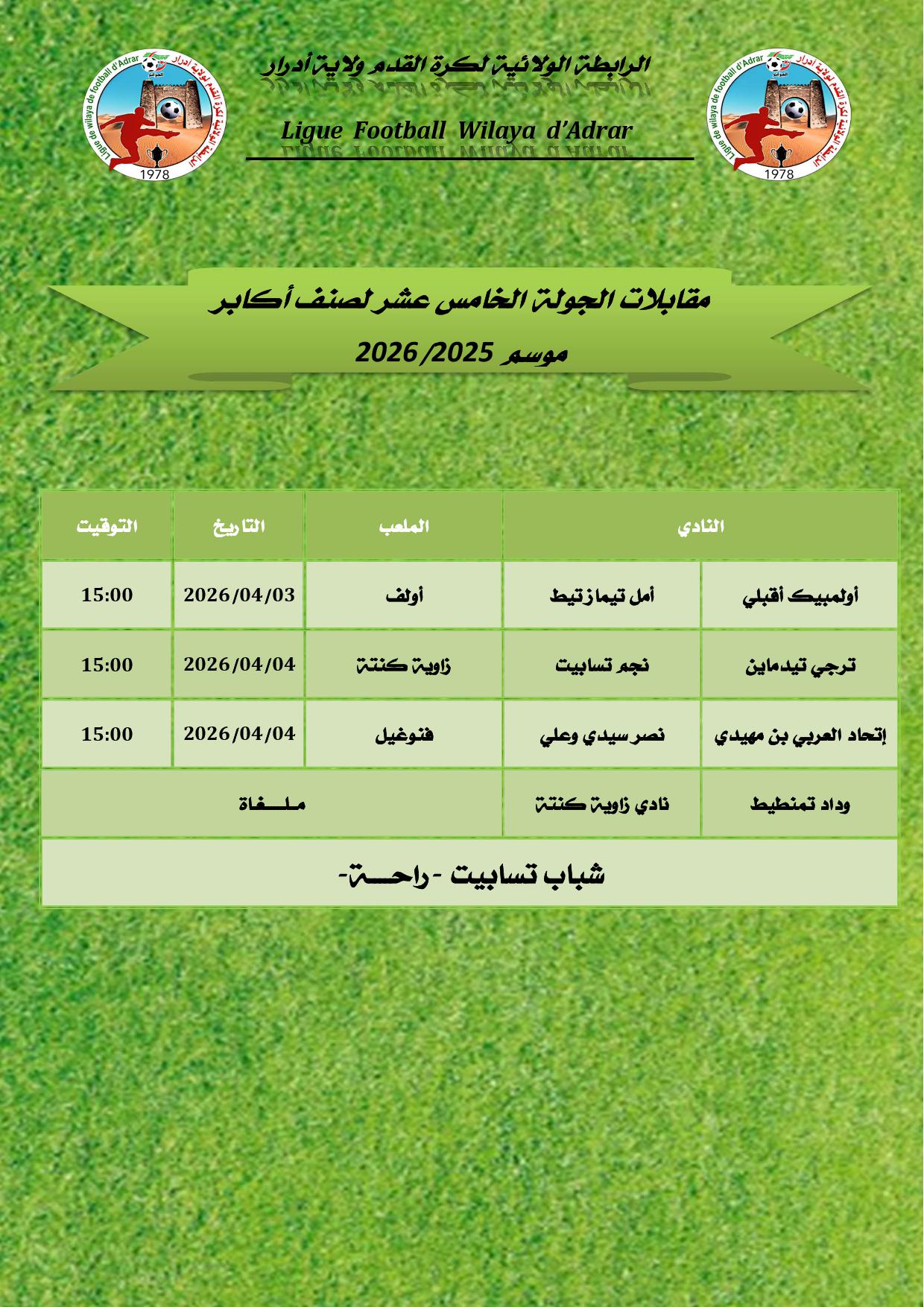 جميع الحقوق محفوظة © 2023 - 2026 الرابطة الولائية لكرة القدم - أدرار.